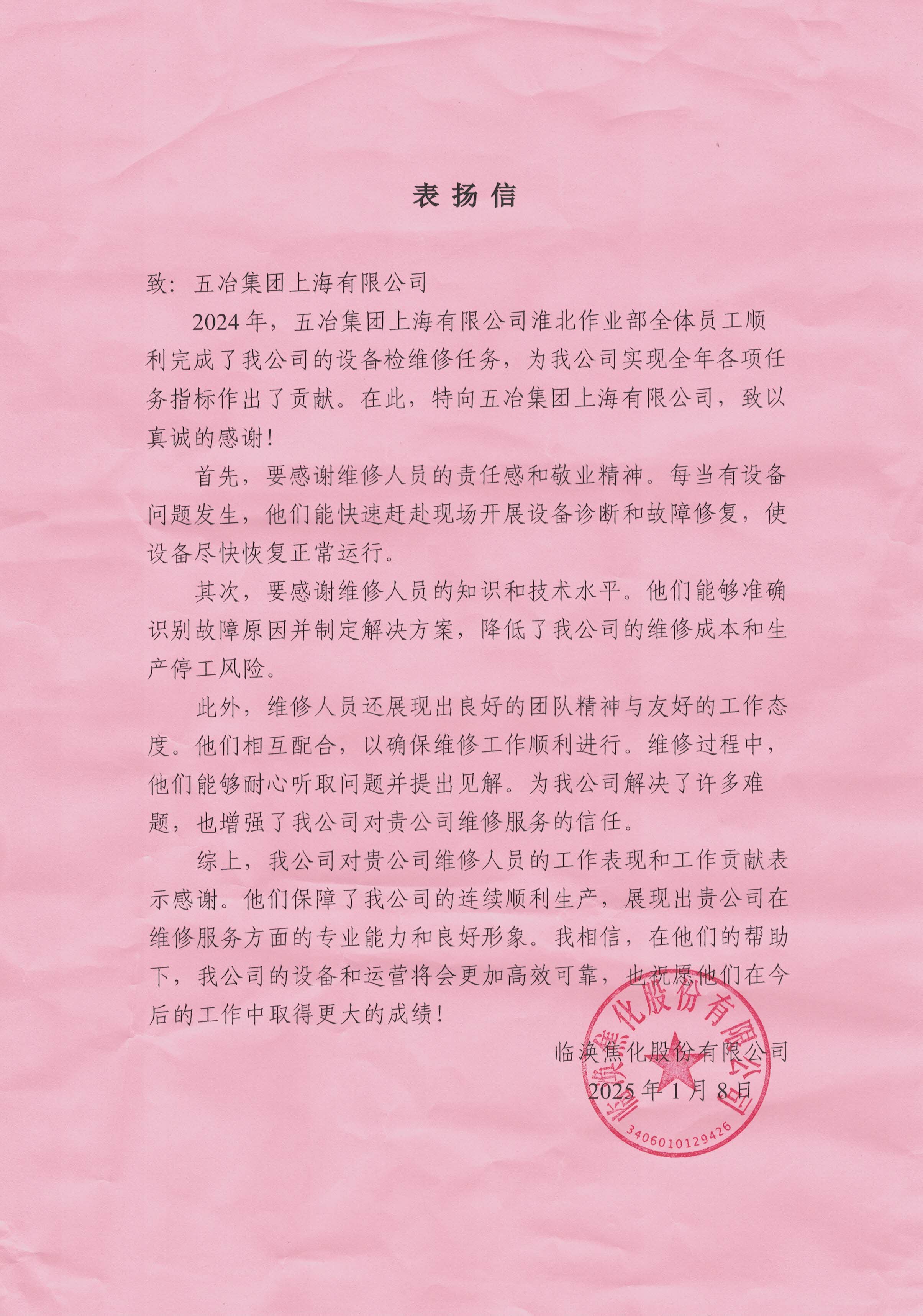 1月15日,中國五冶集團(tuán)工程技術(shù)服務(wù)公司淮北作業(yè)部收到臨渙焦化股份有限公司表揚(yáng)信一封,表揚(yáng)淮北作業(yè)部在2024年順利完成臨渙焦化股份有限公司設(shè)備檢維修任務(wù),為業(yè)主單位實現(xiàn)全年各項任務(wù)指標(biāo)作出貢獻(xiàn)。