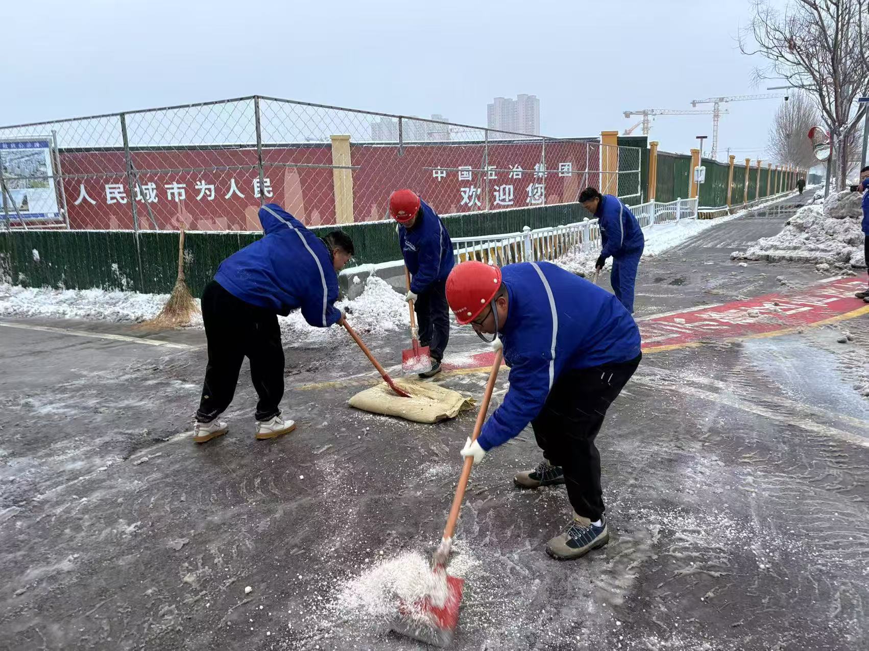 行動(dòng)中,項(xiàng)目團(tuán)隊(duì)兵分兩路。一組由技術(shù)骨干帶隊(duì),對(duì)塔吊、腳手架、深基坑等高風(fēng)險(xiǎn)區(qū)域展開“急診式”排查,僅用1小時(shí)便完成全工地安全隱患整改;另一組則調(diào)配裝載機(jī)、融雪劑等物資,將除雪范圍從工地大門延伸至周邊市政道路。與此同時(shí),青年志愿者主動(dòng)請(qǐng)纓成立社區(qū)支援小分隊(duì),帶著鐵鍬、掃帚奔赴共建社區(qū),一場“保民生、護(hù)安全”的雙線戰(zhàn)役就此打響。