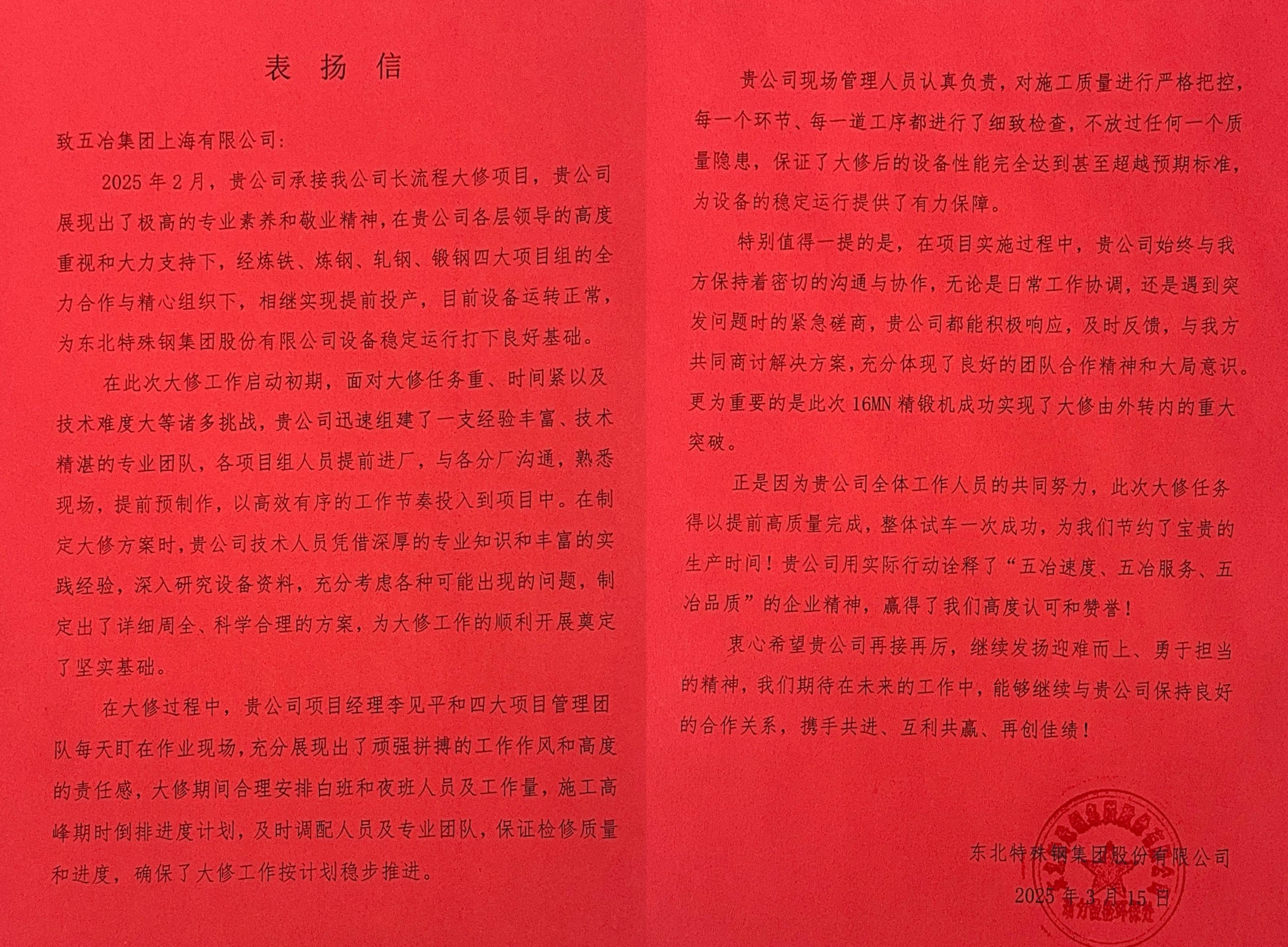 信中指出,此次長流程大修項目,大連特鋼作業部展現出了極高的專業素養和敬業精神,在工程技術服務公司各層級領導的高度重視和大力支持下,經煉鐵、煉鋼、軋鋼、鍛鋼四大項目組的全力合作與精心組織,相繼實現提前投產,目前設備運轉正常,為東北特殊鋼集團股份有限公司設備穩定運行打下良好基礎。在項目實施過程中,大連特鋼作業部始終與業主單位保持密切溝通與協作,無論是日常工作協調,還是遇到突發問題時的緊急磋商,作業部都能積極響應,及時反饋,與業主單位共同商討解決方案,充分體現了良好的團隊合作精神和大局意識。更為重要的是,此次16MN精鍛機成功實現了大修由外轉內的重大突破。