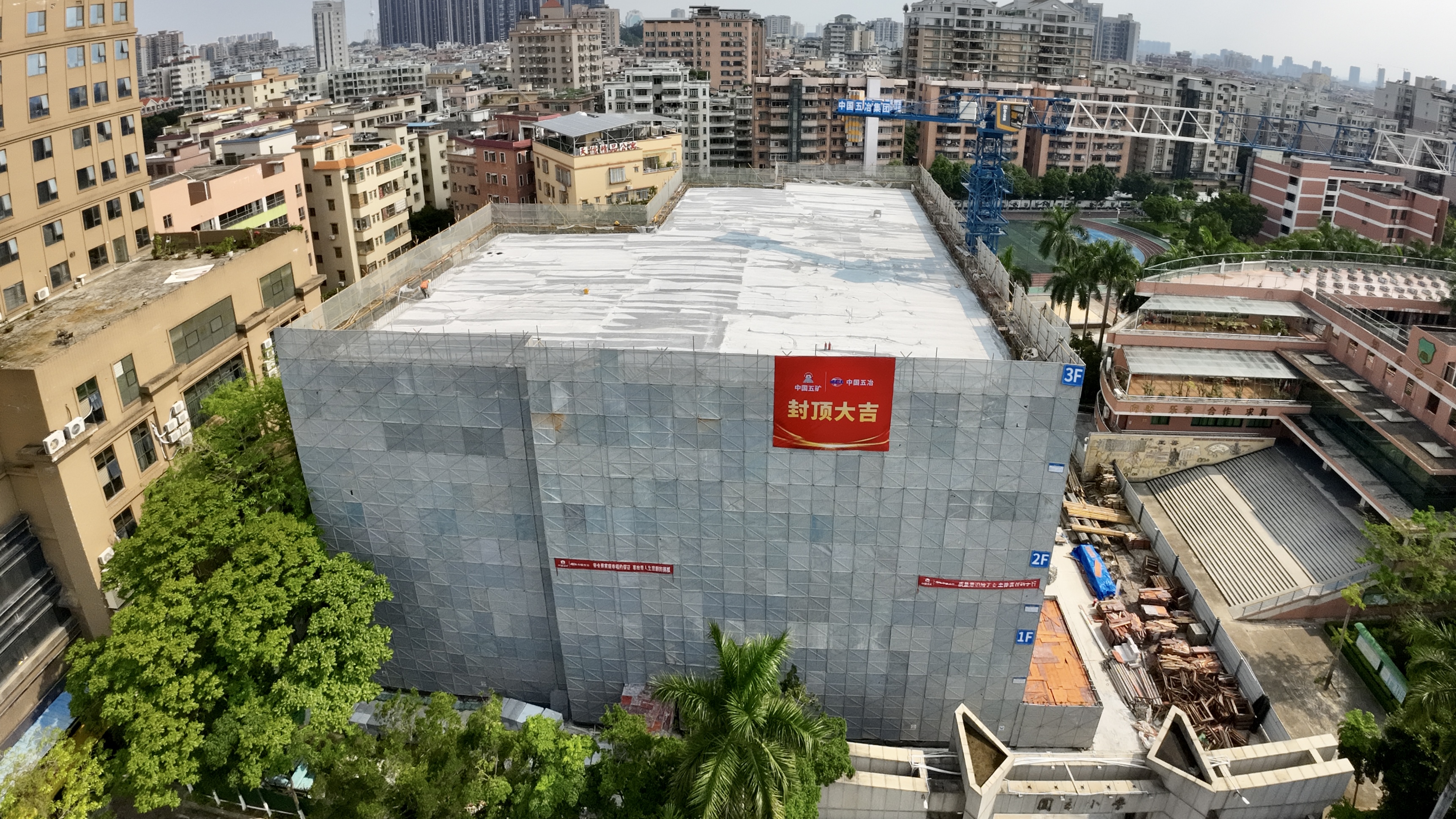 該項目位于花都區迎賓大道繁忙的交通樞紐,在建設過程中,面對場地狹小、材料進出困難、砂層地質地下水含水量高、校內施工噪音污染大等多重挑戰,項目團隊按照“黨建+”引領,將黨建工作融入履約、安全、質量等重點環節,圍繞項目重大工期節點優化施工計劃、創新施工工藝、采取先進的降噪等措施,并積極加強與周邊居委會、城管、交警大隊等多方的溝通協調,及時解決項目推進過程中的重難點問題,有力推動項目順利實現主體結構全面封頂目標。