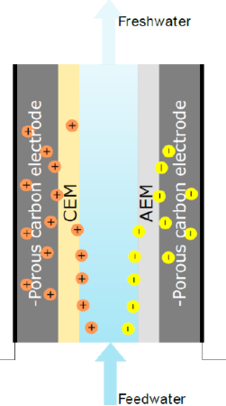 電吸附技術又稱電容去離子技術,通過在電極兩端施加較低電壓,溶液中陰陽離子在電場下分別向正負極移動,并聚集在電極表面的雙電層上而實現鹽的去除。 與傳統的用于化學藥劑去除水污染的技術相比,電吸附技術避免在水體中增加藥劑,只通過電極放電完成,因此不會有額外的廢物產生,無污染、經濟性強。