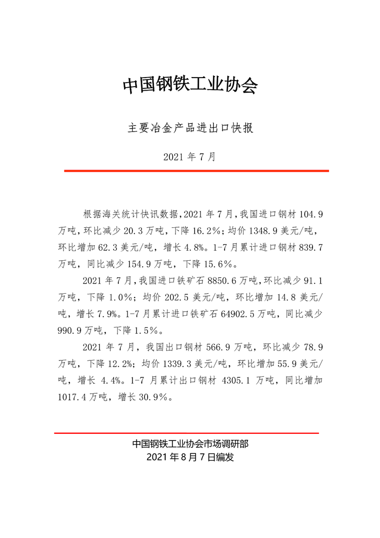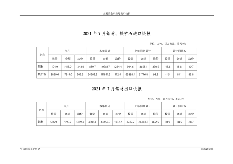 根據(jù)海關(guān)統(tǒng)計快訊數(shù)據(jù),2021年7月,我國進口鋼材104.9萬噸,環(huán)比減少20.3萬噸,下降16.2%;均價1348.9美元/噸,環(huán)比增加62.3美元/噸,增長4.8%。