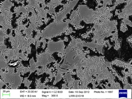 根據頂燃式熱風爐燃燒器復雜惡劣工況條件,研發出高荷軟、低蠕變、高抗熱震的陶瓷燃燒器專用莫來石-紅柱石-堇青石磚,顯微結構如圖18所示。以紅柱石、堇青石為主要原料,利用堇青石低膨脹和紅柱石的富硅玻璃相特性,進行材料成分及相結構設計,協同提升材料高溫性能和抗熱震性能。創新采用M-70燒結莫來石+紅柱石+堇青石工藝方案,通過加入堇青石使制品具有優良的抗熱震性能,加入紅柱石以提高制品的荷重軟化溫度和抗蠕變性,從而獲得優異的綜合高溫性能。多物相協同優化耦合使復合相材料理化性能顯著提升,滿足了熱風爐核心關鍵設備陶瓷燃燒器的性能要求。