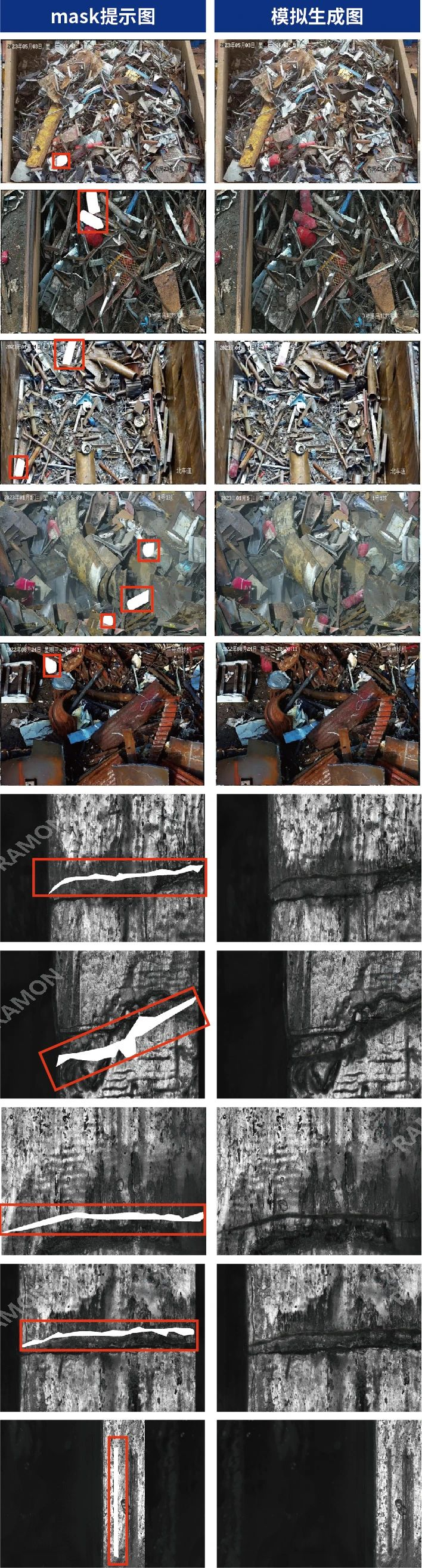 近日,鐳目智眸團隊在鋼鐵視覺領域取得重大突破,成功將AIGC技術應用于提升稀缺樣本異常場景檢測水平,該技術顯著提升了鑄坯缺陷,廢鋼內危險物及拒收件等稀缺數據的采集速度,從而突破了異常情況數據集稀少的瓶頸,極大地提升了異常場景的識別和檢測能力!