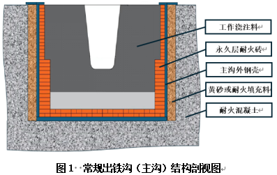 現(xiàn)常規(guī)高爐出鐵溝(主溝)結(jié)構(gòu)見下圖1。主溝鋼殼與耐火混凝土之間會(huì)填充黃砂或耐火填充料,鋼殼內(nèi)部永久層采用耐火磚砌筑,最后澆注主溝工作層澆注料。這樣結(jié)構(gòu)的主溝由于鋼殼埋于黃砂和耐火材料中,鋼殼熱量無法散出,隨著主溝工作層侵蝕,鋼殼溫度會(huì)不斷升高,當(dāng)工作層厚度達(dá)到200mm左右時(shí),鐵溝鋼殼溫度會(huì)的達(dá)到700℃以上。這樣的高溫會(huì)導(dǎo)致鋼殼膨脹變形,長(zhǎng)期反復(fù)變形會(huì)不斷加劇,伴隨出現(xiàn)開焊開裂。鋼殼對(duì)耐材約束和支撐作用失去,會(huì)導(dǎo)致溝襯開裂,特別勾機(jī)打溝過程更易造成溝襯的損傷和劣化。這也是現(xiàn)常規(guī)主溝一般一代溝役只有3-5年就需要重新更換鋼殼,且在這3-5年中主溝周期維修用料量不斷增加,但周期壽命卻不斷降低,同時(shí)漏鐵風(fēng)險(xiǎn)也逐年增大。