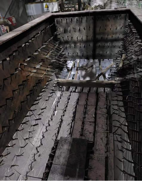 五是錨固鉤長度、分叉角度,以及對其排列方式進行調整。錨固鉤作用是用來加固永久層澆注料整體結構強度,所以,其長度要統一標準,過長、過短都影響其整體結構的穩定性。分叉角度統一120°,用來加大與永久層澆注料的接觸面積,同時,錨固鉤統一橫向排列。