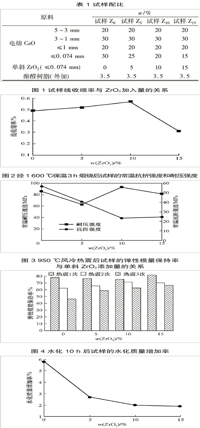 試驗采用化學組成(w)為CaO 94.52%、MgO 1.78%、Al2O3 1.34%、SiO2 0.69%、Na2O 0.12%、 Fe2O3 0.08%的電熔 CaO砂( 5毫米 ~ 3毫米、3毫米~1毫米、≤1毫米和≤0.074毫米)為主原料,w(ZrO2)≥98.5%的單斜ZrO2(≤0.074毫米)為添加劑,熱固性酚醛樹脂為結合劑。