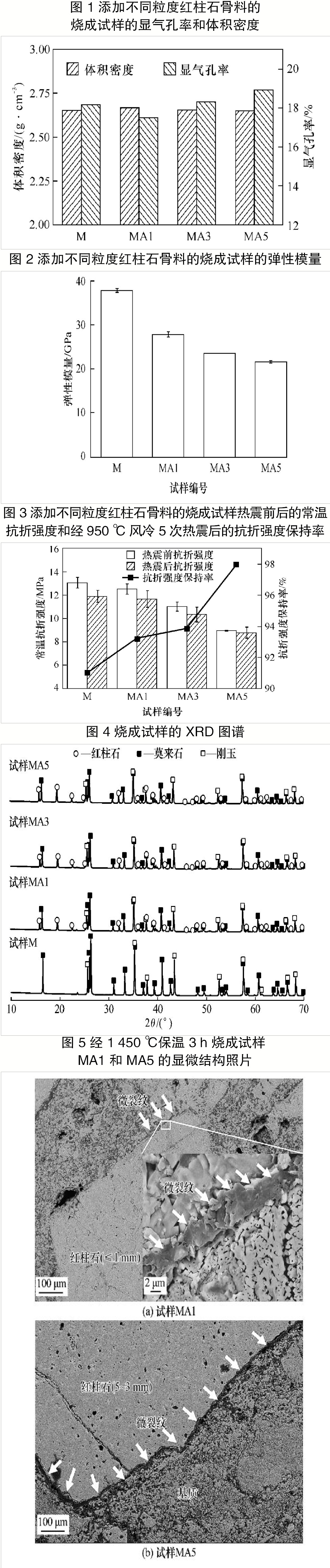 經(jīng)1450℃保溫3h燒成試樣的體積密度和顯氣孔率如圖1所示。由圖1可知,各試樣的體積密度基本相同;添加20%( w) 的≤1 mm 紅柱石的試樣MA1顯氣孔率最低,但隨著添加紅柱石骨料粒度的增加,試樣的顯氣孔率有逐漸提高趨勢(shì)。