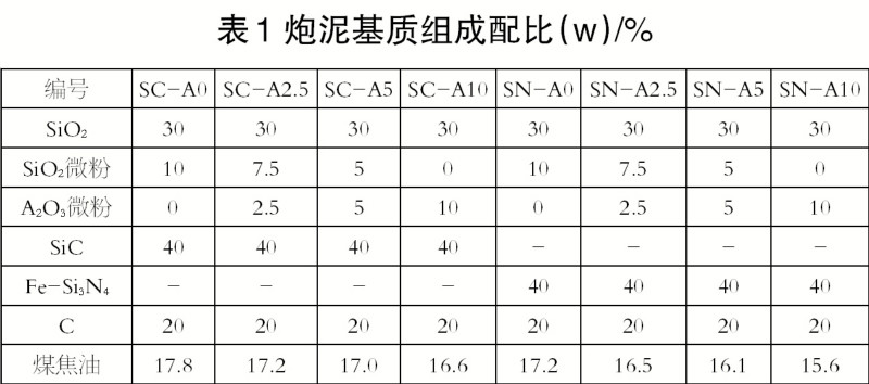 試驗采用兩種基質組成的炮泥作對比:SiC-C-SiO2(SC-A)和Si3N4-C-SiO2(SN-A),Al2O3微粉加入量分別為0、2.5%、5%、10%,同時改變SiO2微粉的加入量,具體配方見表1。按配方稱料,混合均勻并加入煤焦油后在行星式攪拌機中混合20分鐘。調整煤焦油的加入量使每組料具有相同的馬夏值。在5兆帕下壓制成尺寸為160 毫米×40 毫米×40 毫米的試樣后,將試樣在300攝氏度下預先熱處理12 小時,然后在電爐中埋焦炭條件下和溫度為1500攝氏度時分別在3小時和24小時燒成。