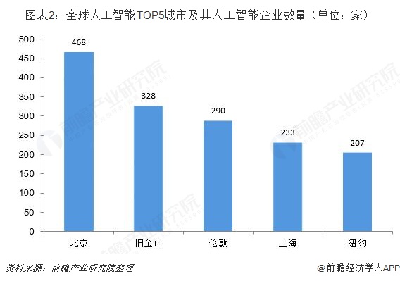 從人工智能企業(yè)城市分布來看,北京以468家企業(yè)個(gè)數(shù)拔得頭籌,其次為舊金山,328家企業(yè)、倫敦則位列第三,為290家;上海緊隨其后,為233家;紐約排第五,為207家。從城市分布看,中國人工智能企業(yè)主要集中在北上廣和江浙地區(qū),美國人工智能企業(yè)則主要集中在加州、紐約州和馬塞諸塞州。